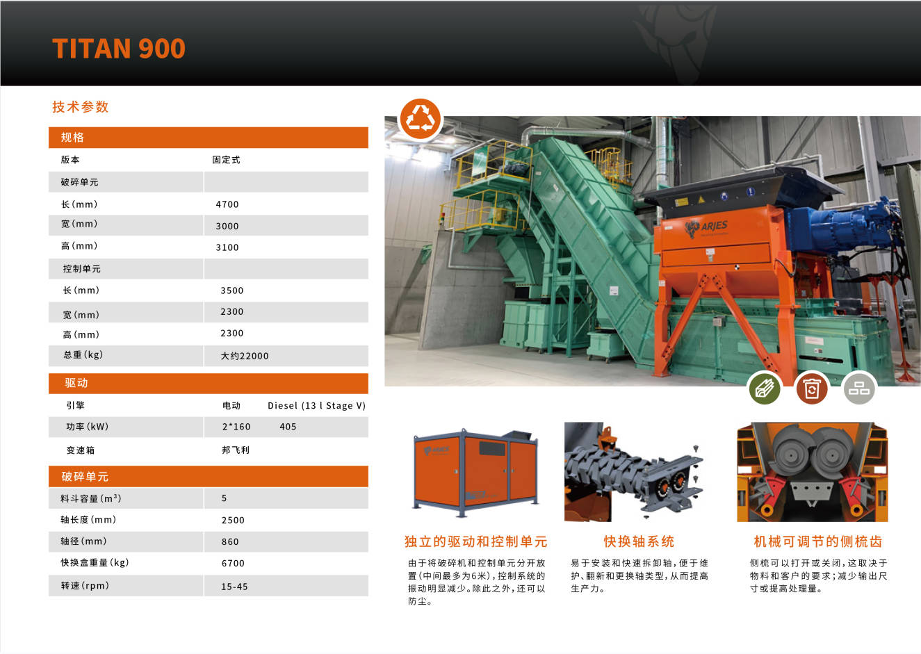 ARJES公司以其雙軸撕碎機(jī)而聞名,其產(chǎn)品具有超高的移動(dòng)性能。ARJES TITAN 900 系列重型撕碎機(jī)是根據(jù)市場(chǎng)多場(chǎng)景應(yīng)用需求設(shè)計(jì)并制造的固廢垃圾處理設(shè)備,可破碎各種堅(jiān)硬的物料,例如瓦礫,混凝土等,以應(yīng)對(duì)國(guó)內(nèi)市場(chǎng)急需的環(huán)保型建筑垃圾循環(huán)利用設(shè)備。德國(guó)原裝的這款設(shè)備,可移動(dòng),可固定;功能強(qiáng),能耗低,可處理大型輪胎、大件垃圾、建筑垃圾、漁網(wǎng)等多種廢棄物,適合高處理量的需求。