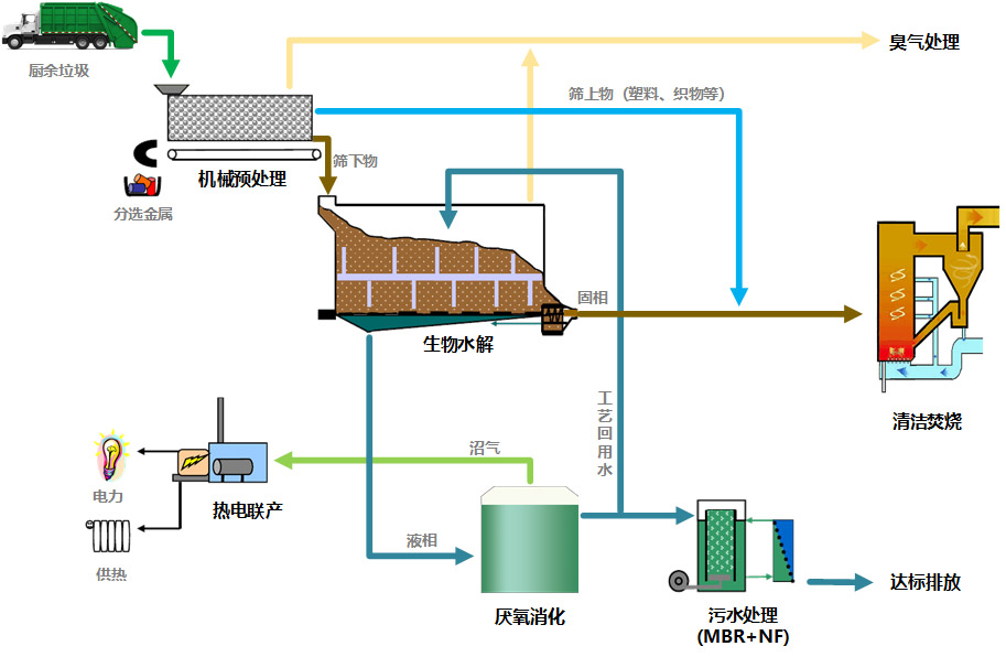 廚余垃圾經(jīng)過(guò)通過(guò)機(jī)械預(yù)處理、生物水解處理,分離出金屬和惰性雜物,并形成高熱值固相(RDF)和有機(jī)漿液。高熱值固相可通過(guò)清潔焚燒、工業(yè)窯爐等方式進(jìn)行熱能利用;有機(jī)漿液通過(guò)厭氧消化產(chǎn)生沼氣,可用于熱電聯(lián)產(chǎn)或制成壓縮天然氣銷(xiāo)售。