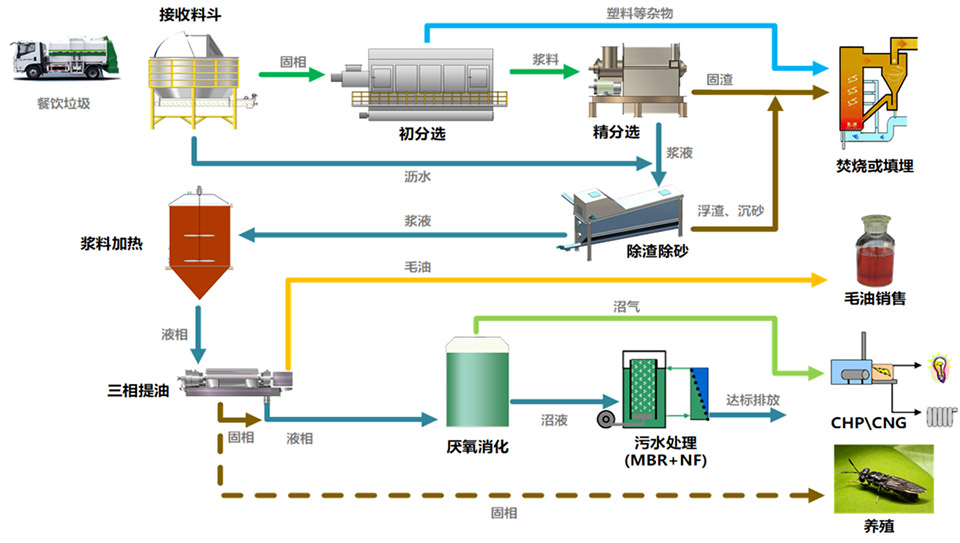 餐廚垃圾經(jīng)過(guò)機(jī)械分選、加熱分離、提油處理,形成有機(jī)漿液、毛油、有機(jī)物渣、固相雜物等。有機(jī)漿液通過(guò)厭氧消化產(chǎn)生沼氣,可用于熱電聯(lián)產(chǎn)或制成壓縮天然氣銷售;毛油純度>97%,可作為工業(yè)原料、生物柴油原料銷售;高品質(zhì)有機(jī)固渣可用于養(yǎng)殖;其它固渣可通過(guò)填埋或焚燒處理。